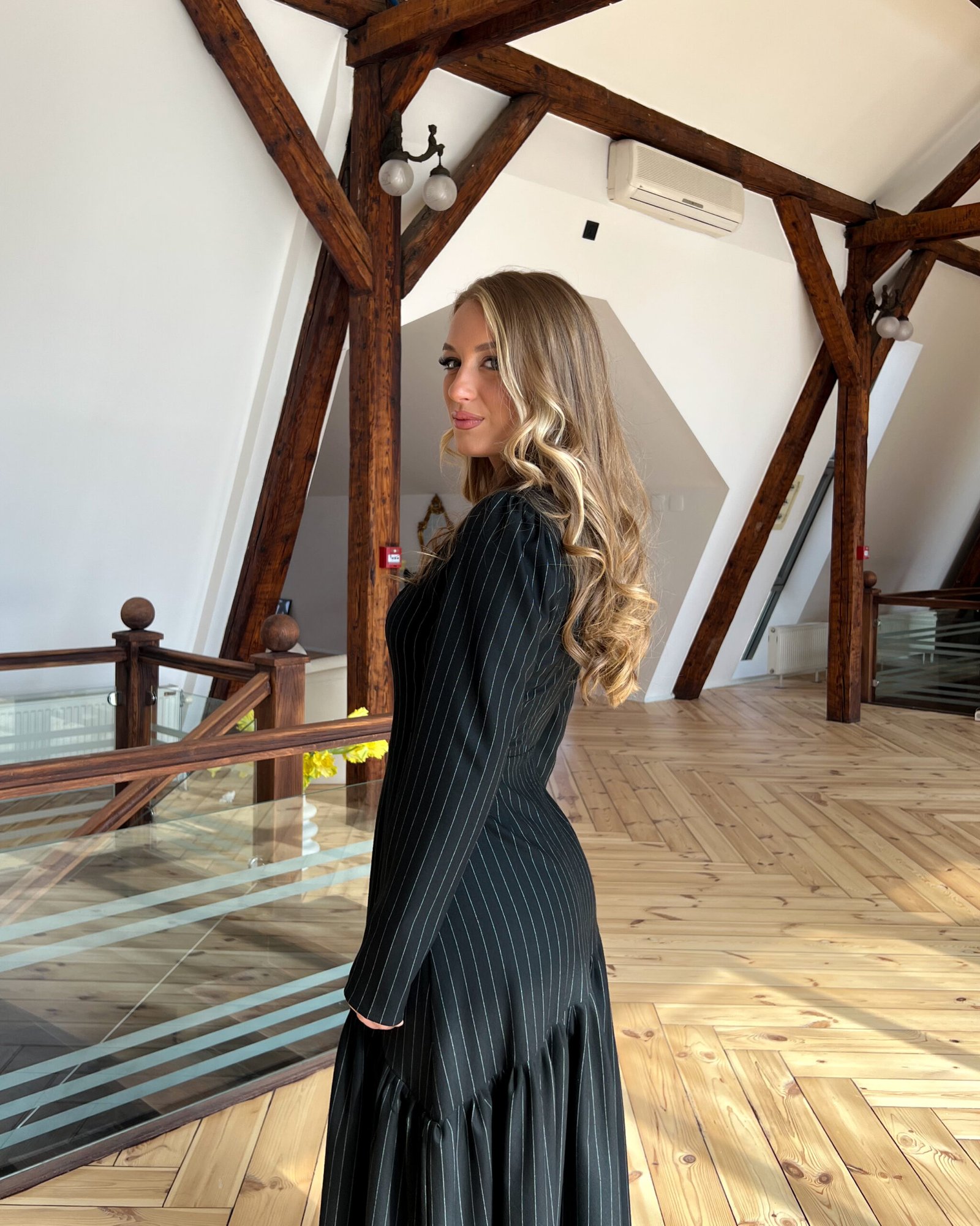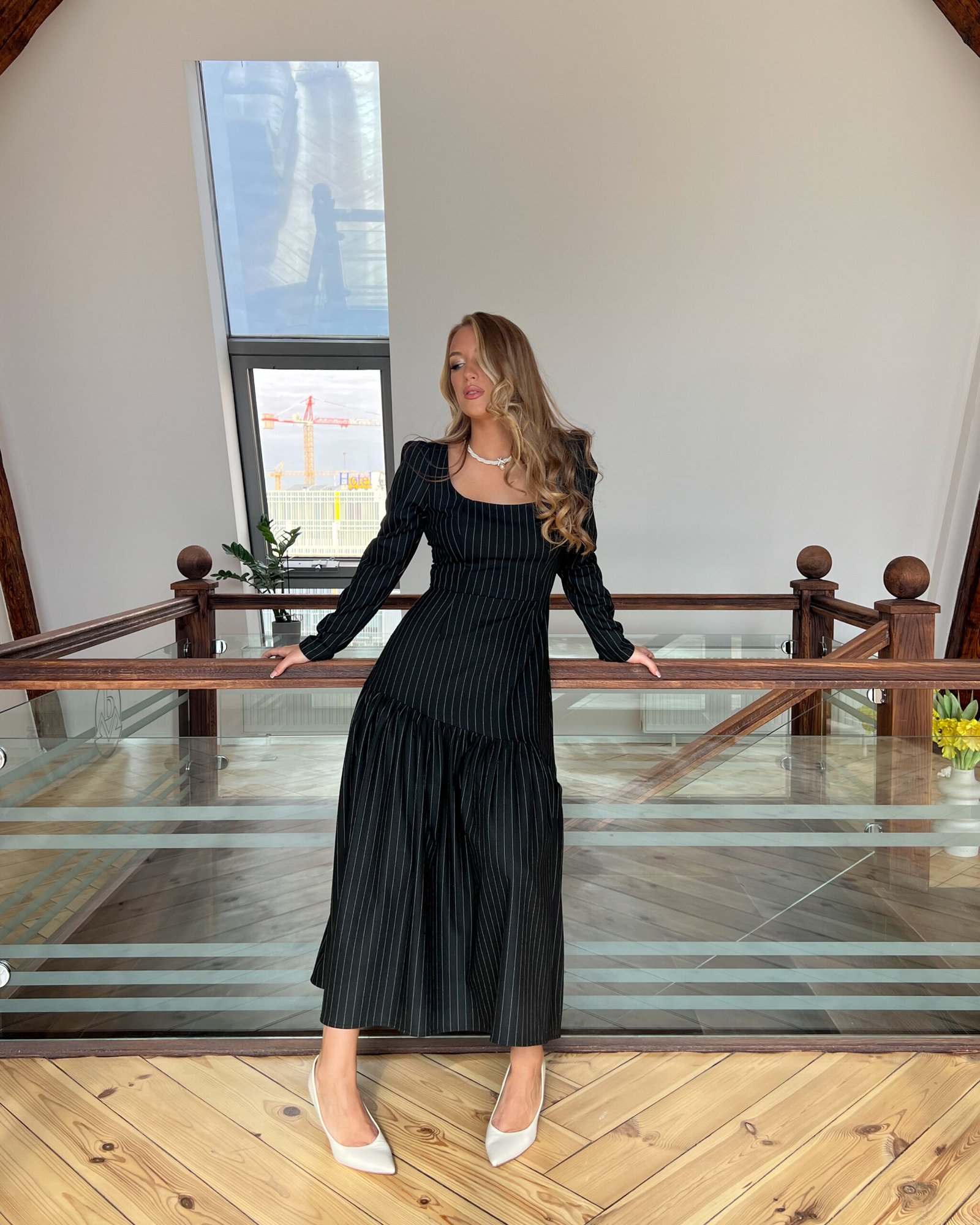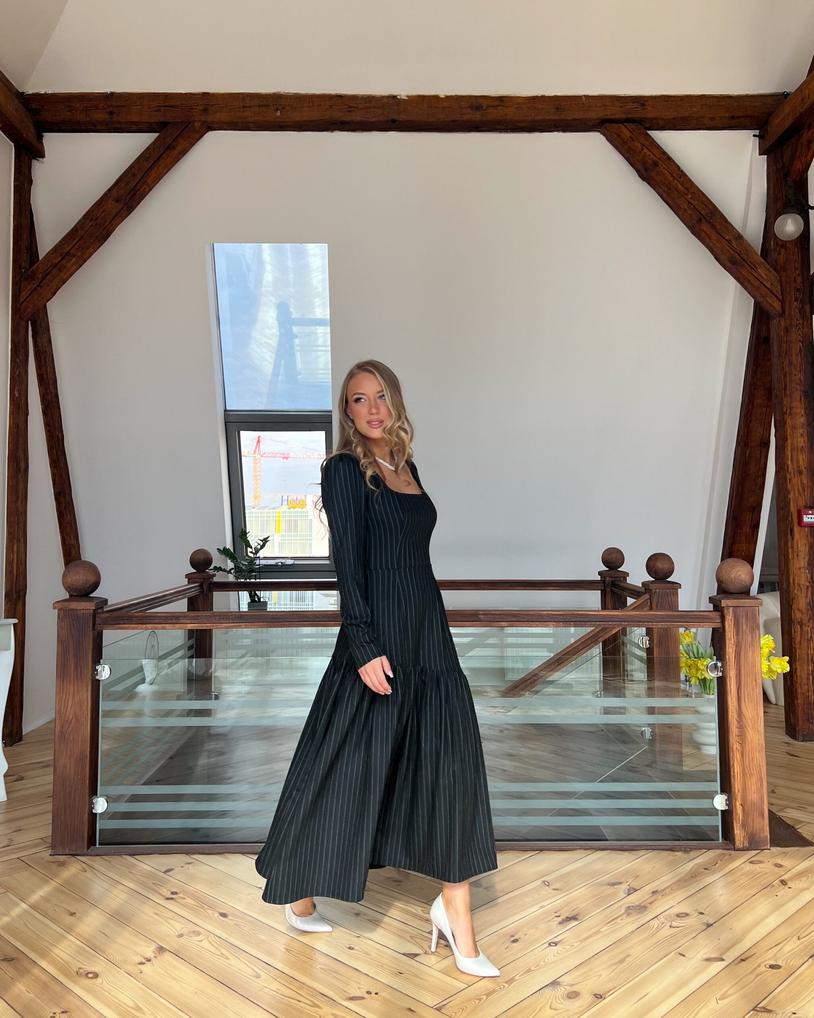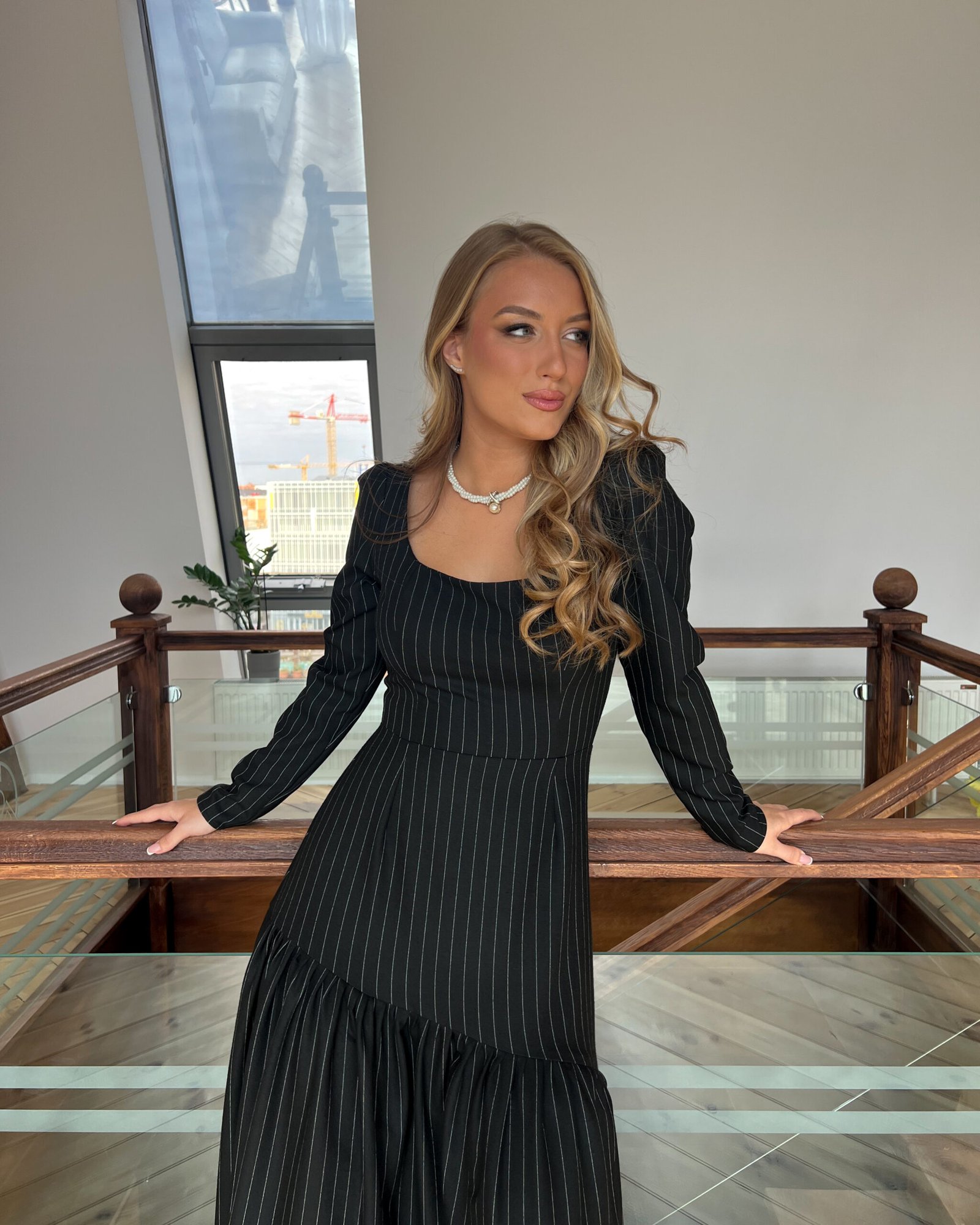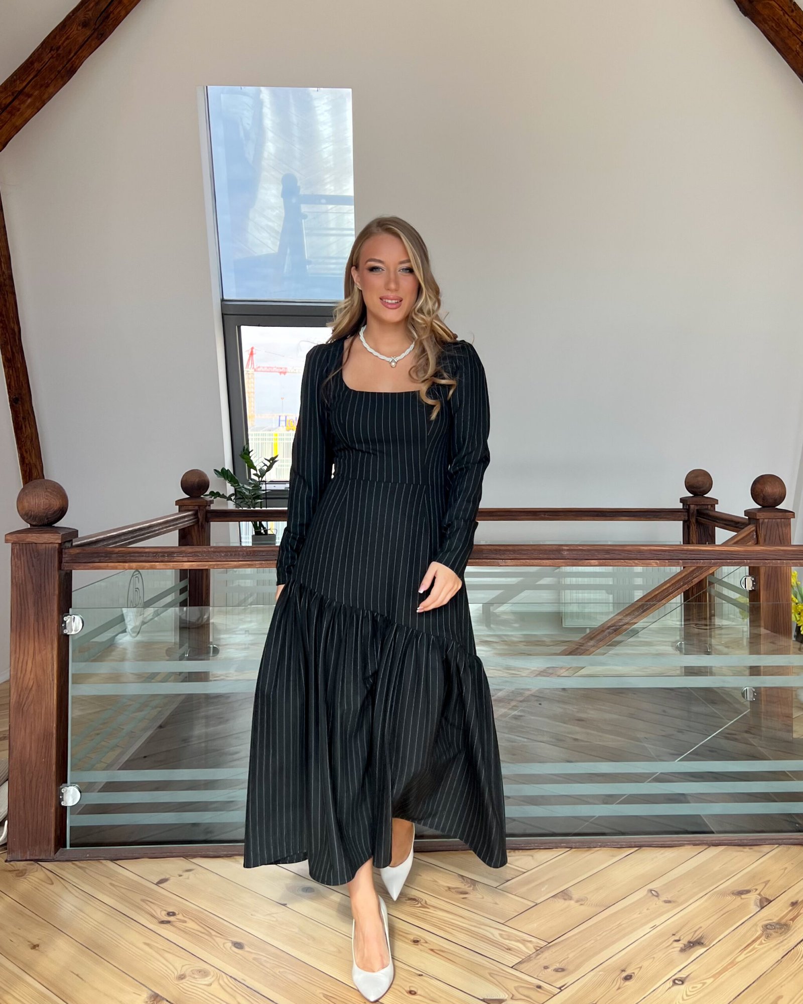 Kad pomislimo na crnu eleganciju, to je upravo ova haljina. Suptilna, pristojna, udobna i elegantna haljina. Savršena za celodnevne poslovne prilike. Izradjena od crnog viskoznog štofa sa belim štraftama.