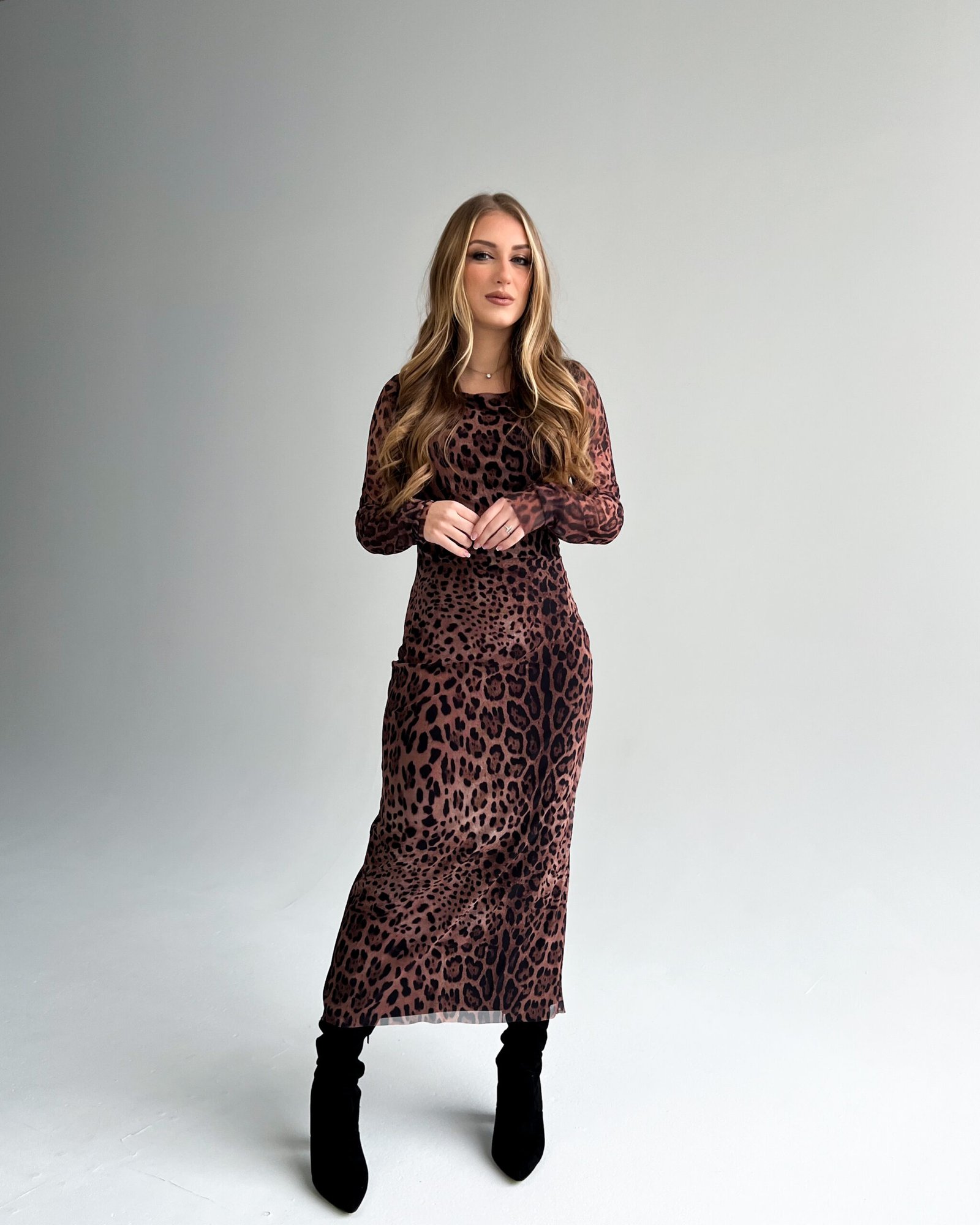 Uska dugacka haljina izradjena od rastegljive duo mrezice. Postvaljena je cela likrom. Ima blagi „čamac“ izrez i duboki prorez nazad na duzini.
