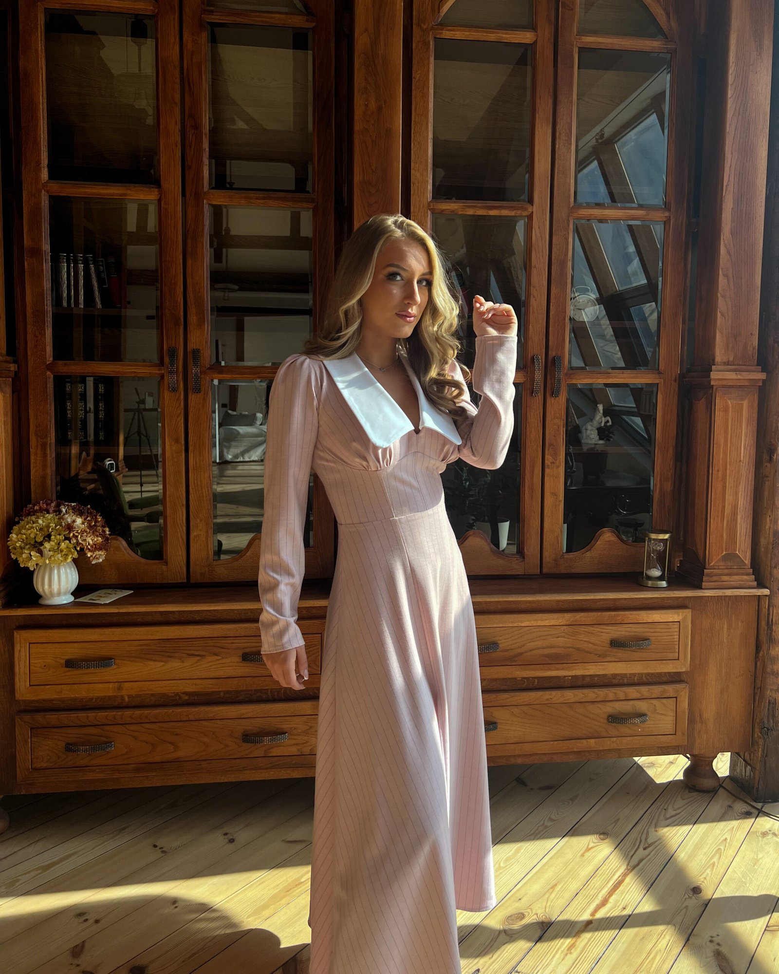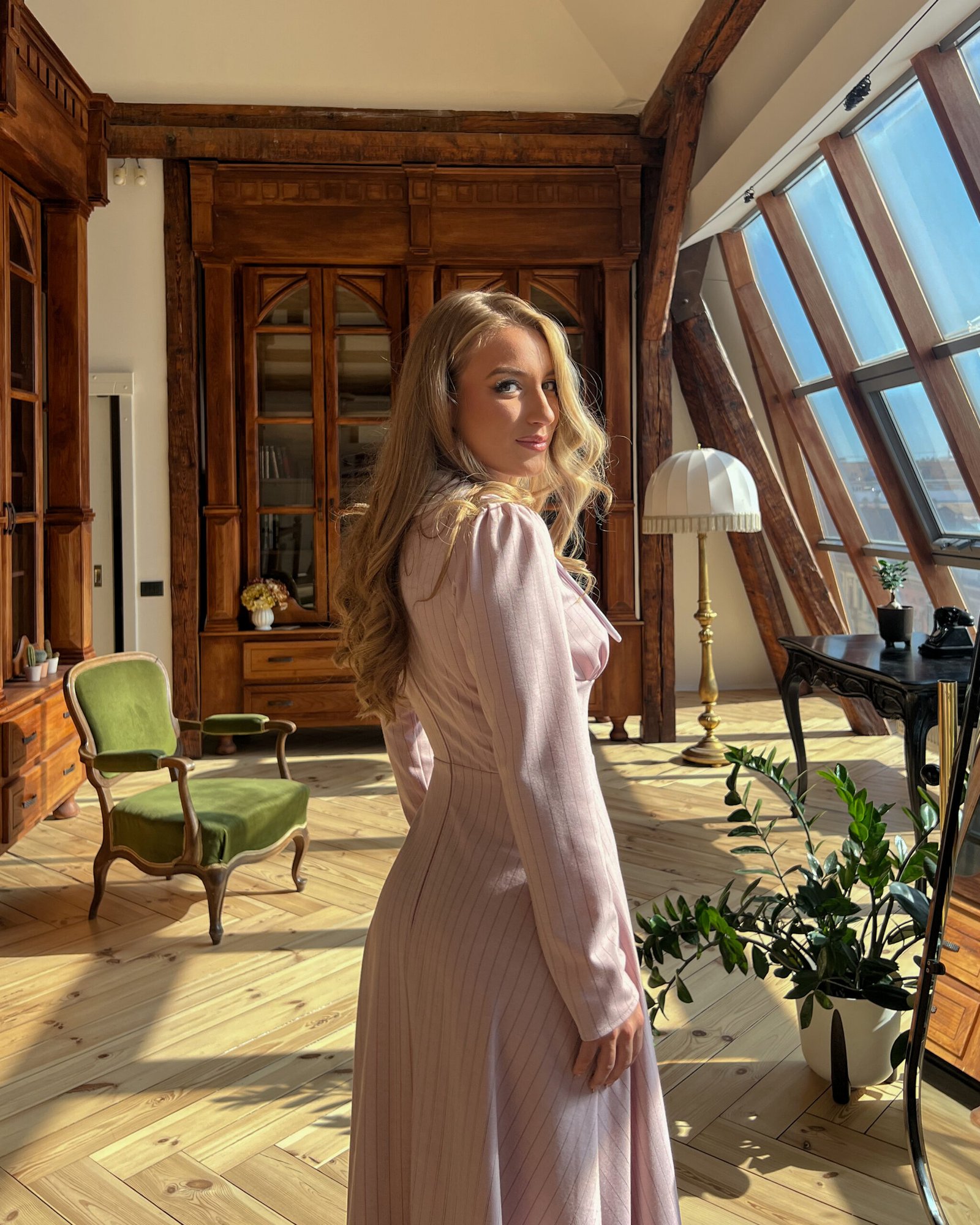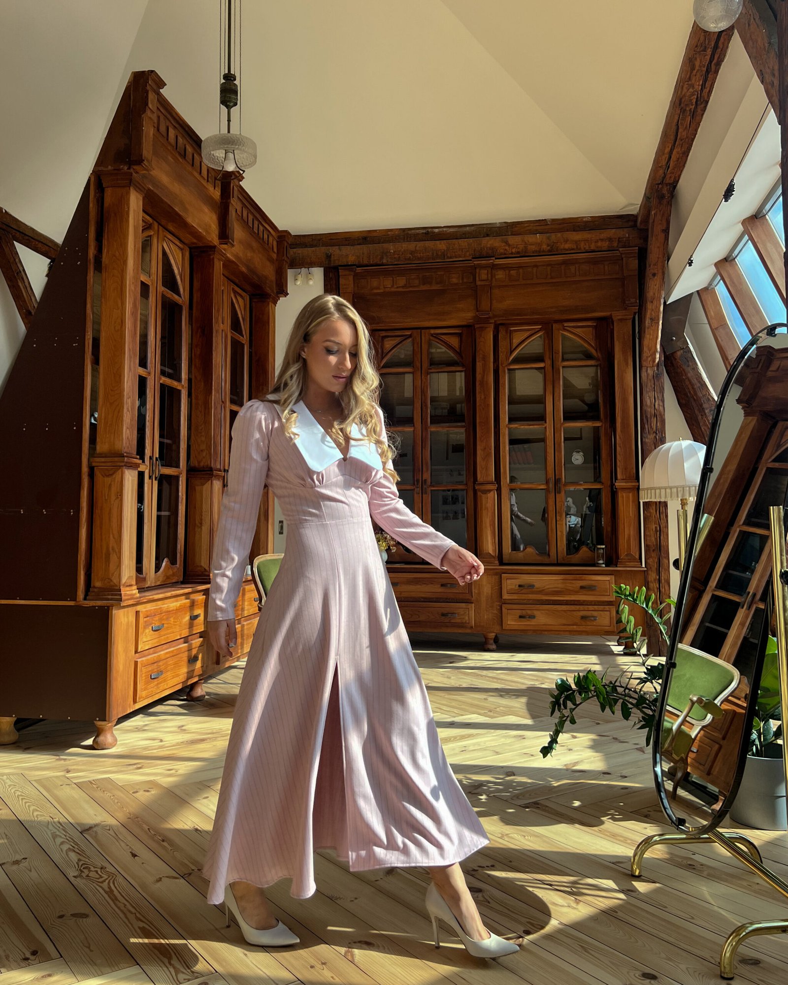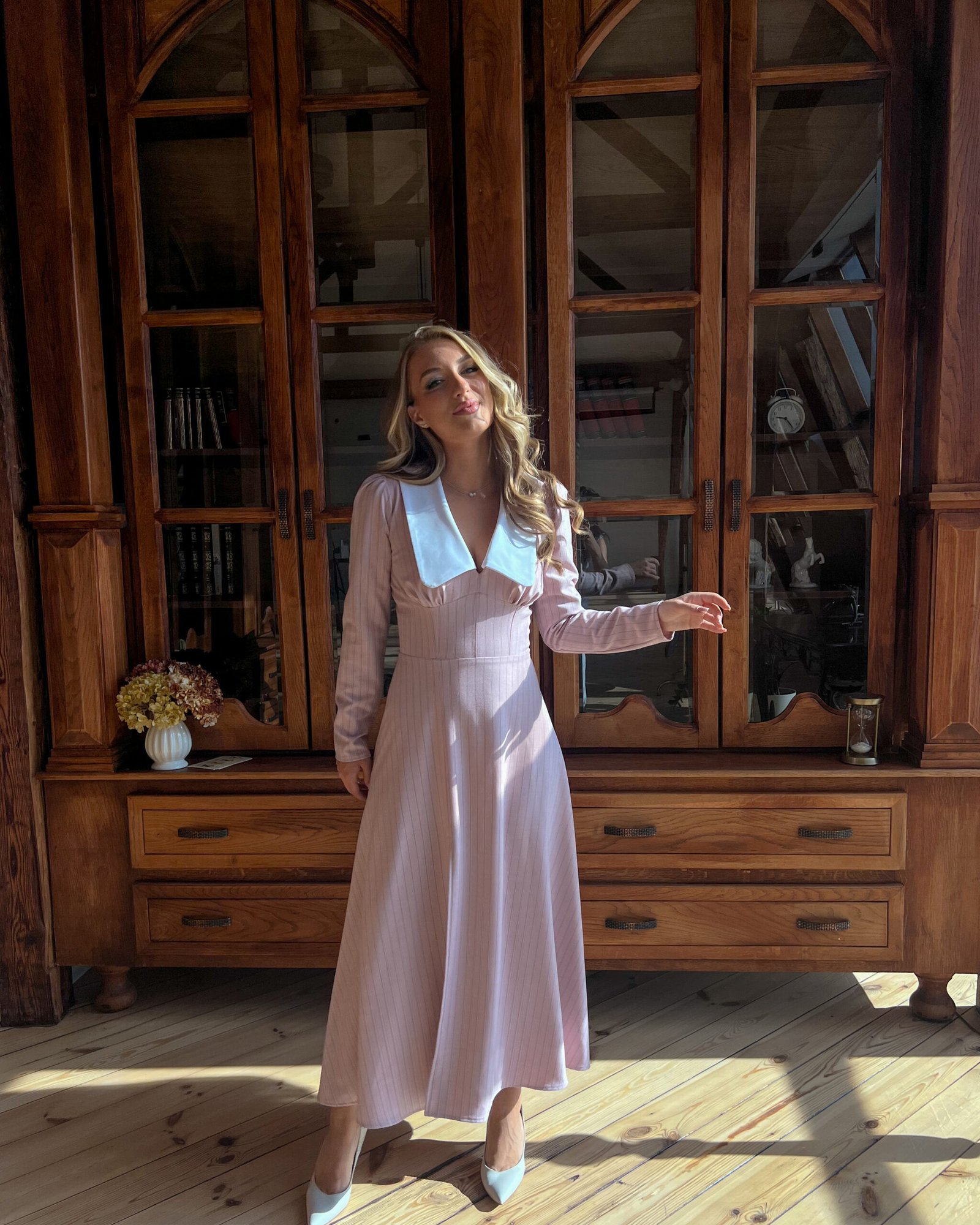 Haljina suptilne elegancije, sa belom kragnom i blagim puf rukavima u svetlo rozoj nijansi sa crnim štraftama. Izradjena od viskoznog štofa. Idealna za jesenje dane, pruža u isto vreme suptilnu eleganciju i udobnost za svaku priliku.