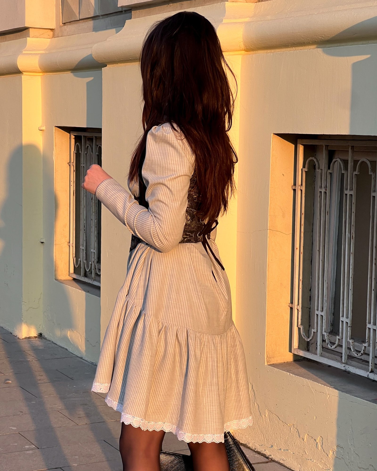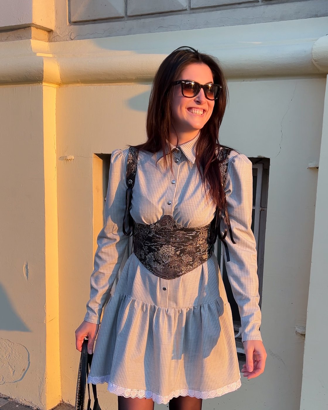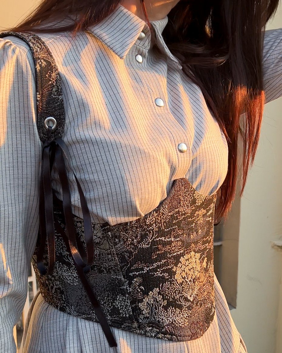 Korset izradjen od finog brokata, ojacan fisbajnima i postavljen. Korset se nazad vezuje paspul trakom cime se podesava zategnutost korseta. Secen je ispod grudi, sto ce svaku siru haljinu uciniti zanimljivijom.