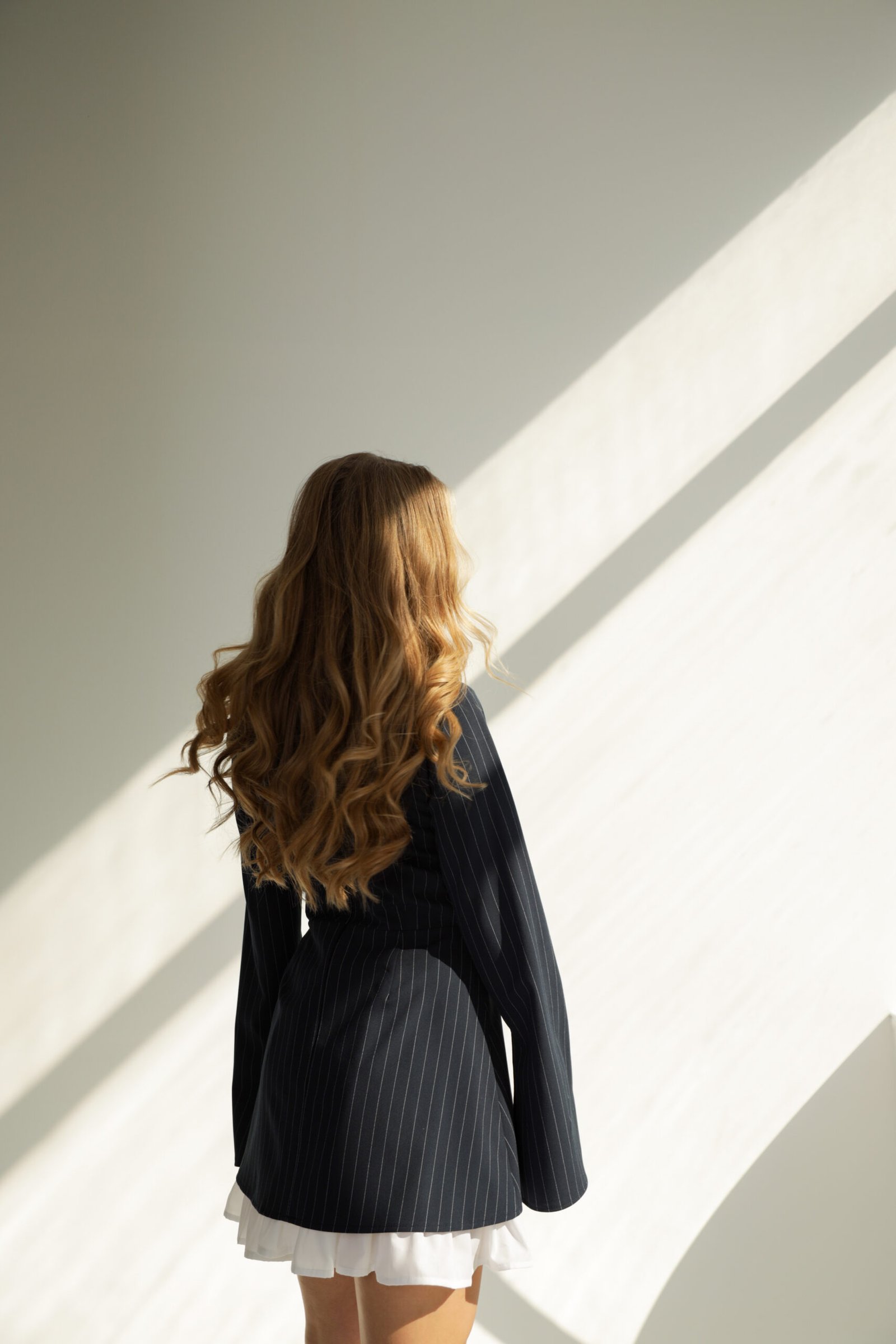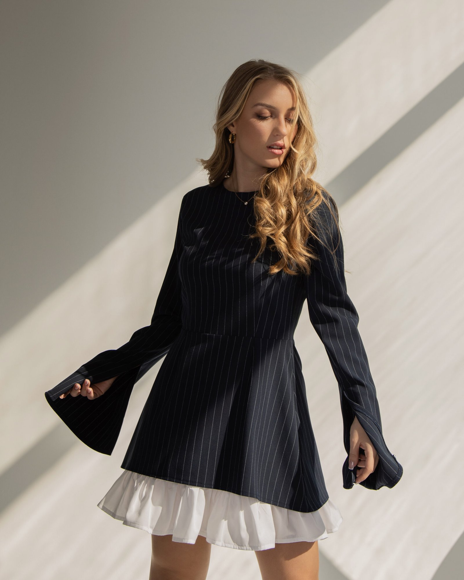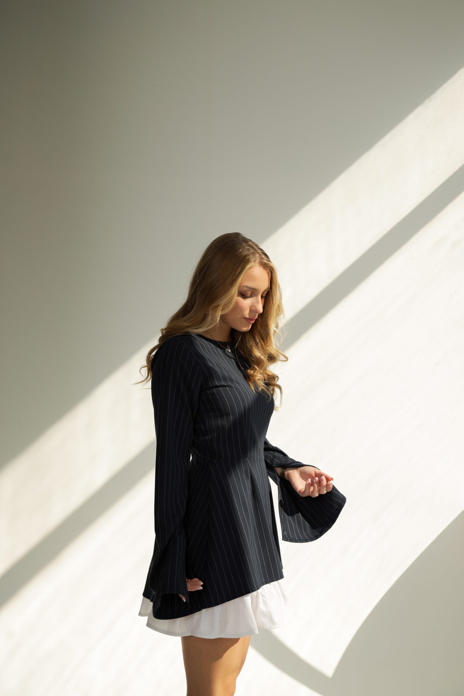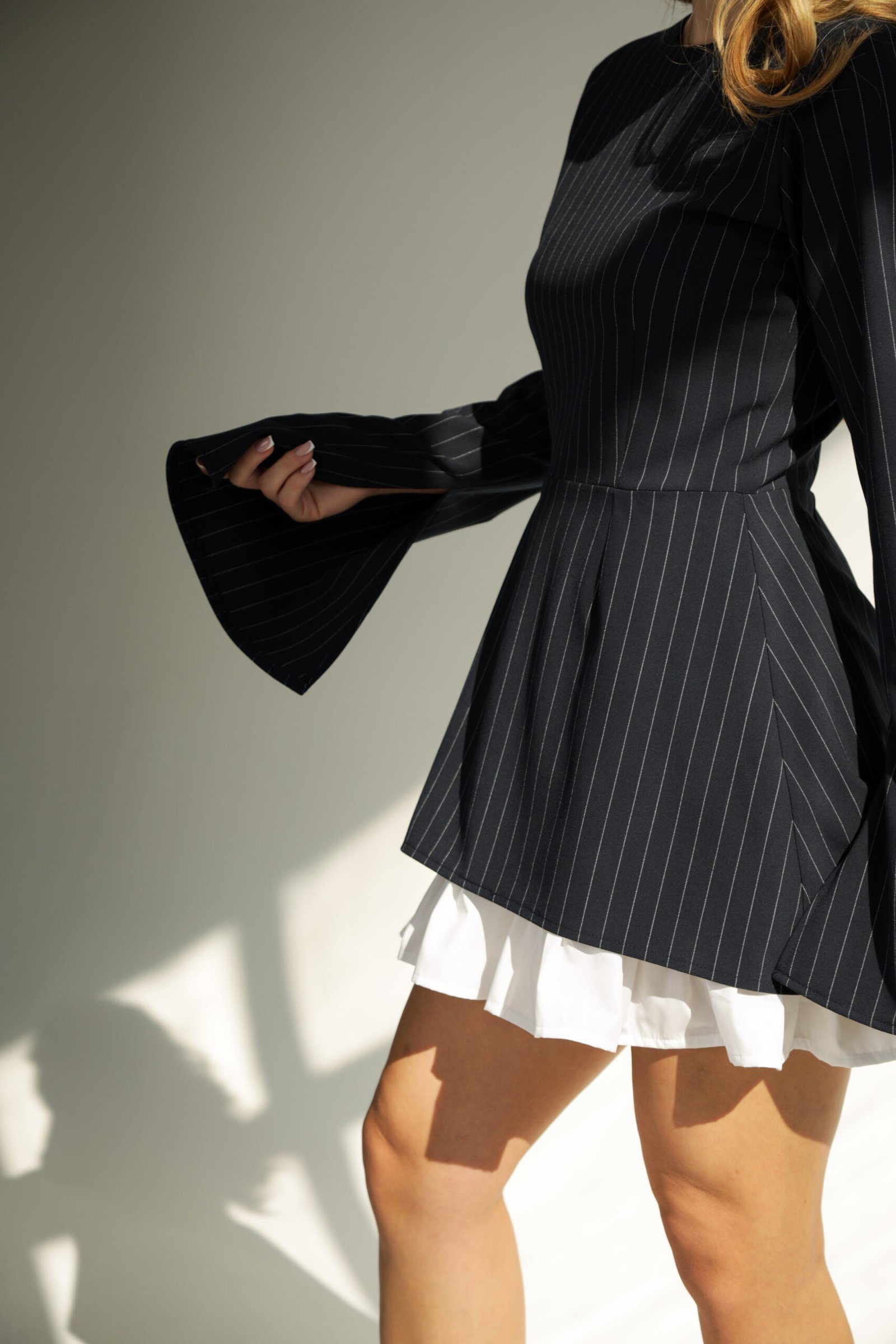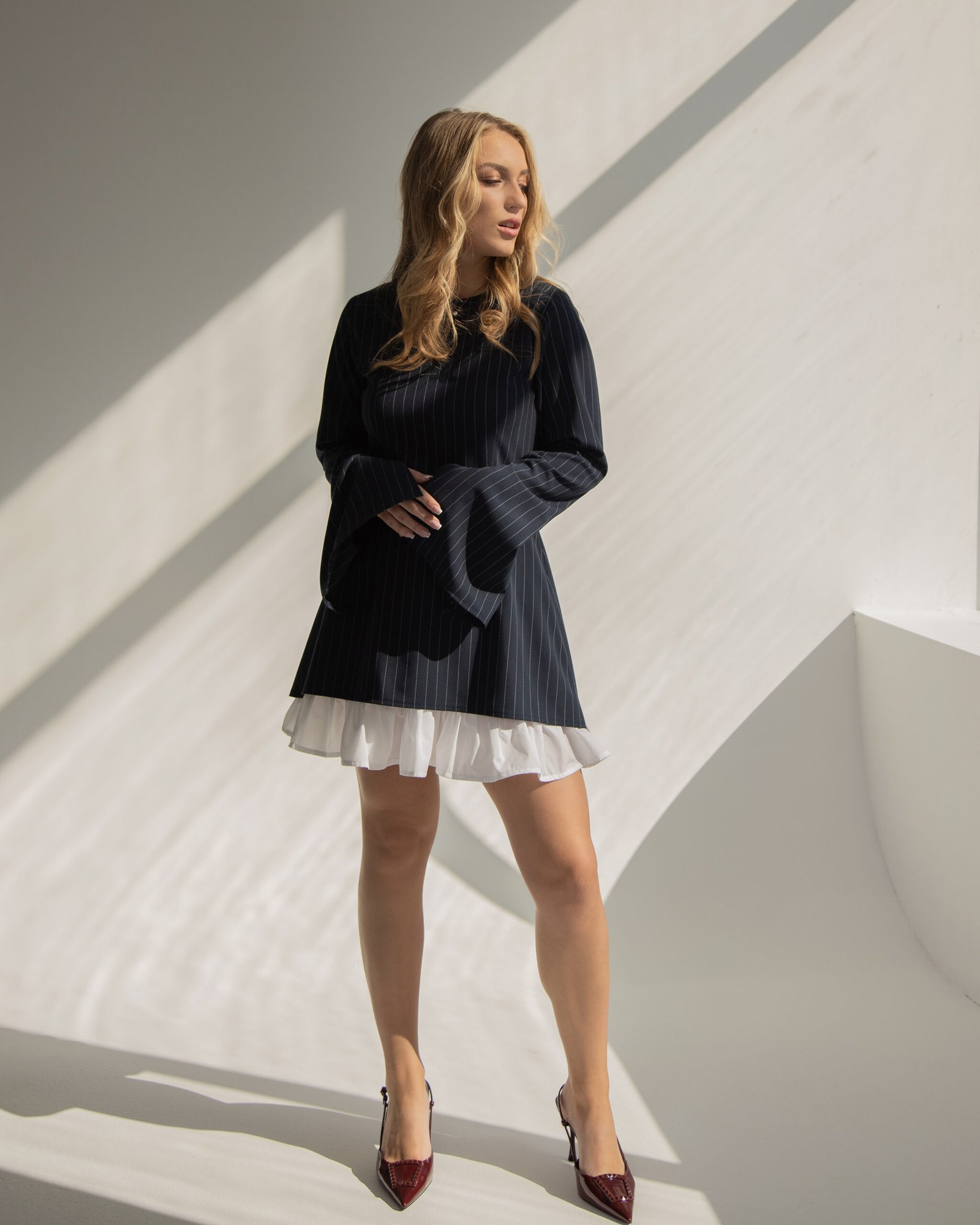 Jesenja haljina sa zvonastim rukavima. U gornjem delu prati liniju tela, od struka se siri i time vizuelno istice uzi struk. Haljina se sastoji iz dva dela, haljina i podsuknja.