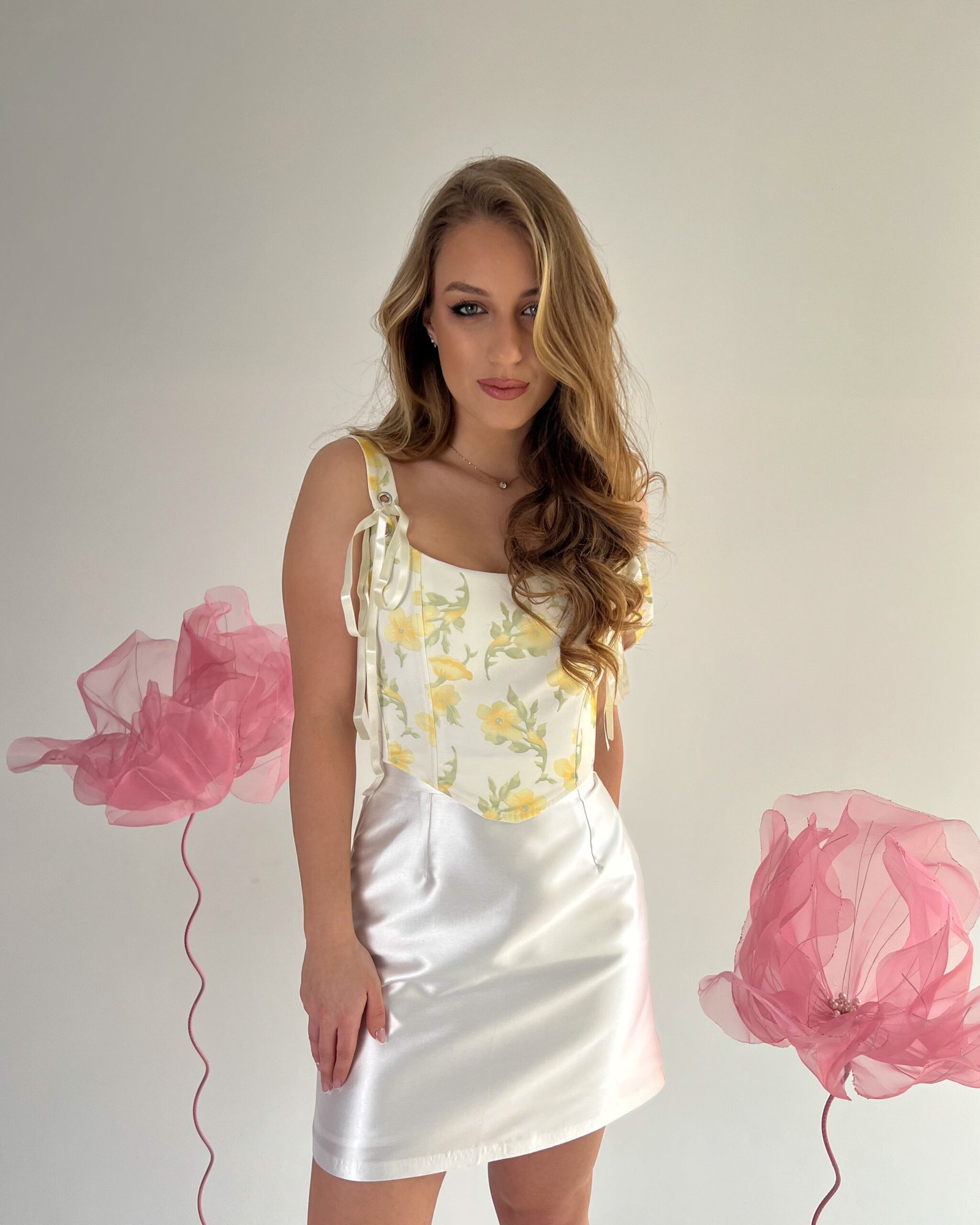 Letnji lagan korset, izrađen od organdina i satena. Model je ojačan fisbjanima i podesiv trakicama na ledjima.
